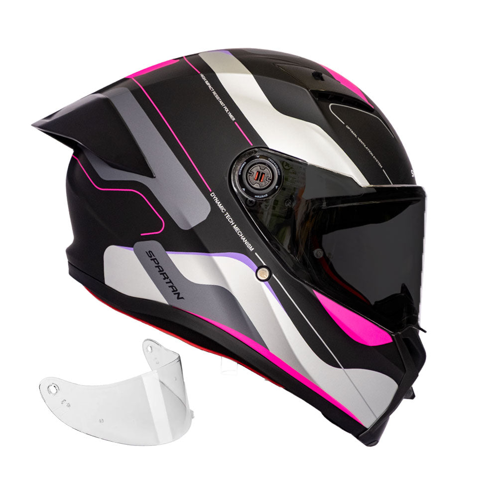 El Spartan Fénix es un integral con certificación ECE 22.06, construcción en policarbonato de alto impacto y sistema de ventilación eficiente. Incluye cambio rápido de visor (Dynamic Tech), preparado para Pinlock e intercom, y un diseño aerodinámico con alerón removible. Seguridad moderna con estilo agresivo.