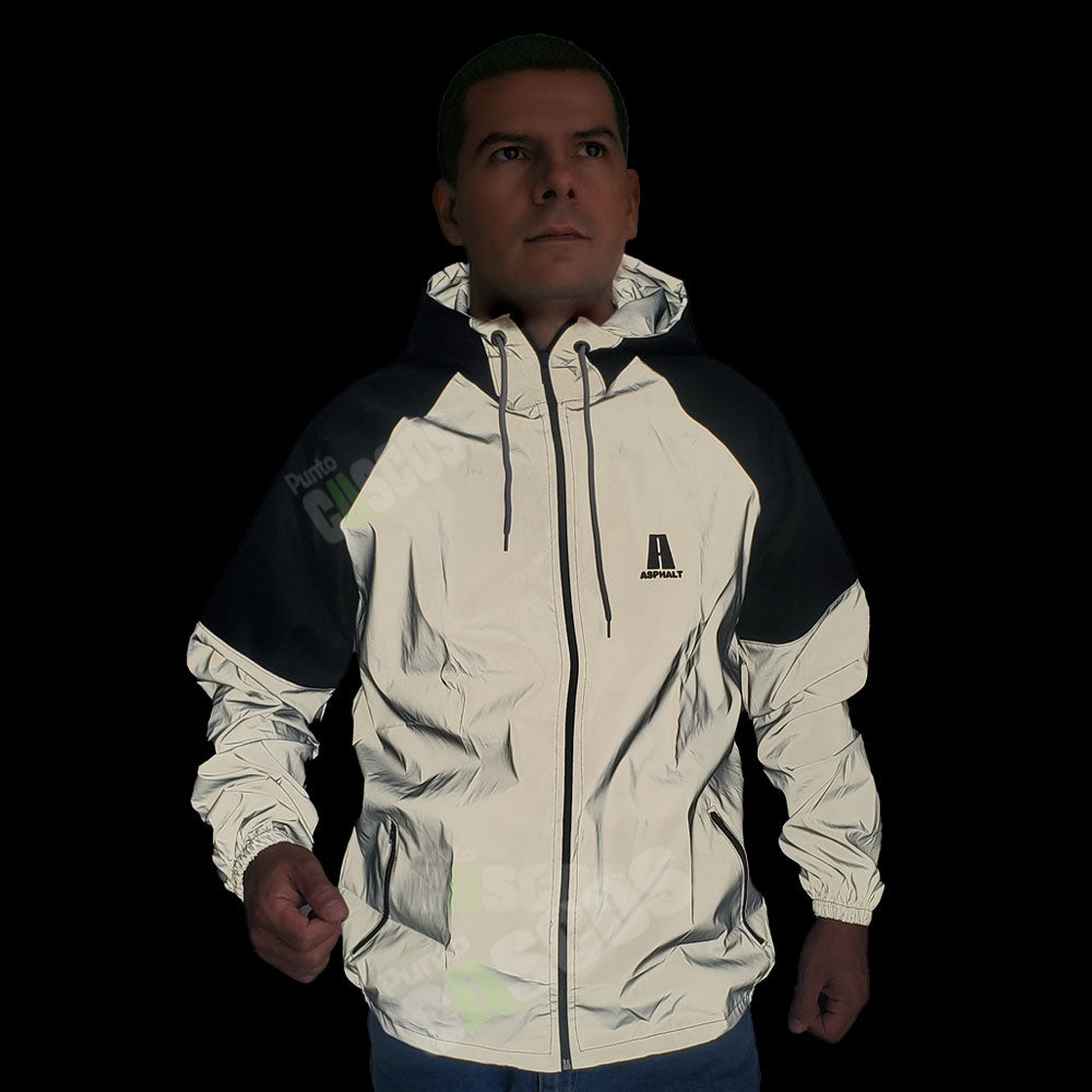Con esta chaqueta corta vientos reflectiva sí que te haces ver bien. No solo por la llamativa tela 100% reflectiva con diseño que te hará brillar en la noche, si no también por su diseño con insertos en tela resistente para evitar el desgaste de la chaqueta en las zonas propensas a la alta fricción
